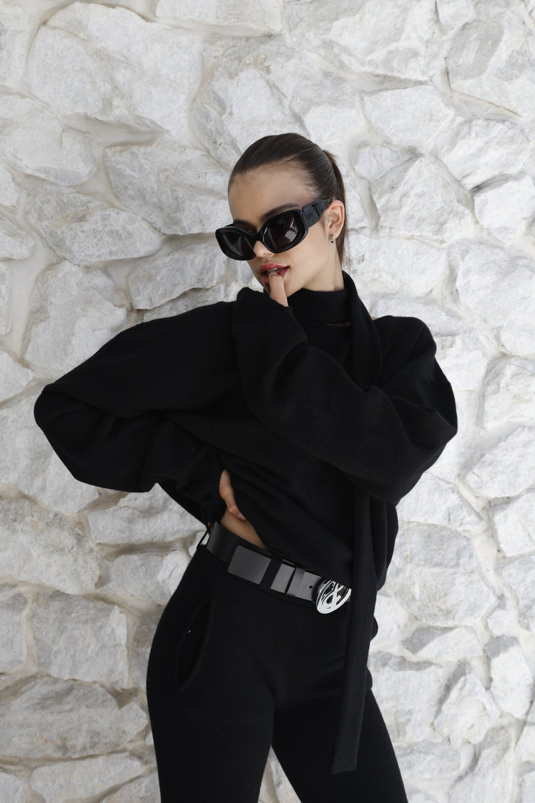 Batwing knit sweater with a boatneck and matching skinny scarf, made from 100 percent merino wool.