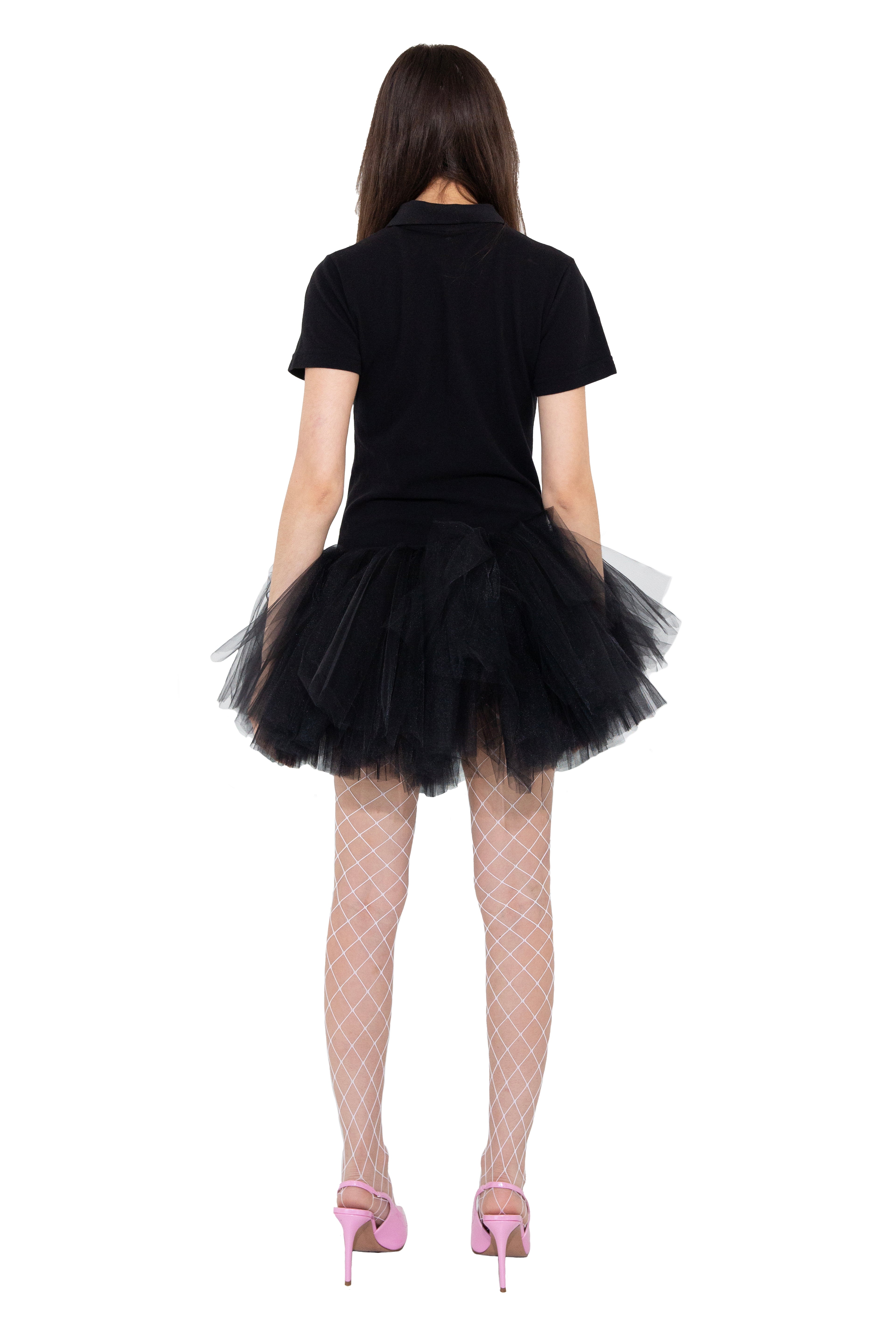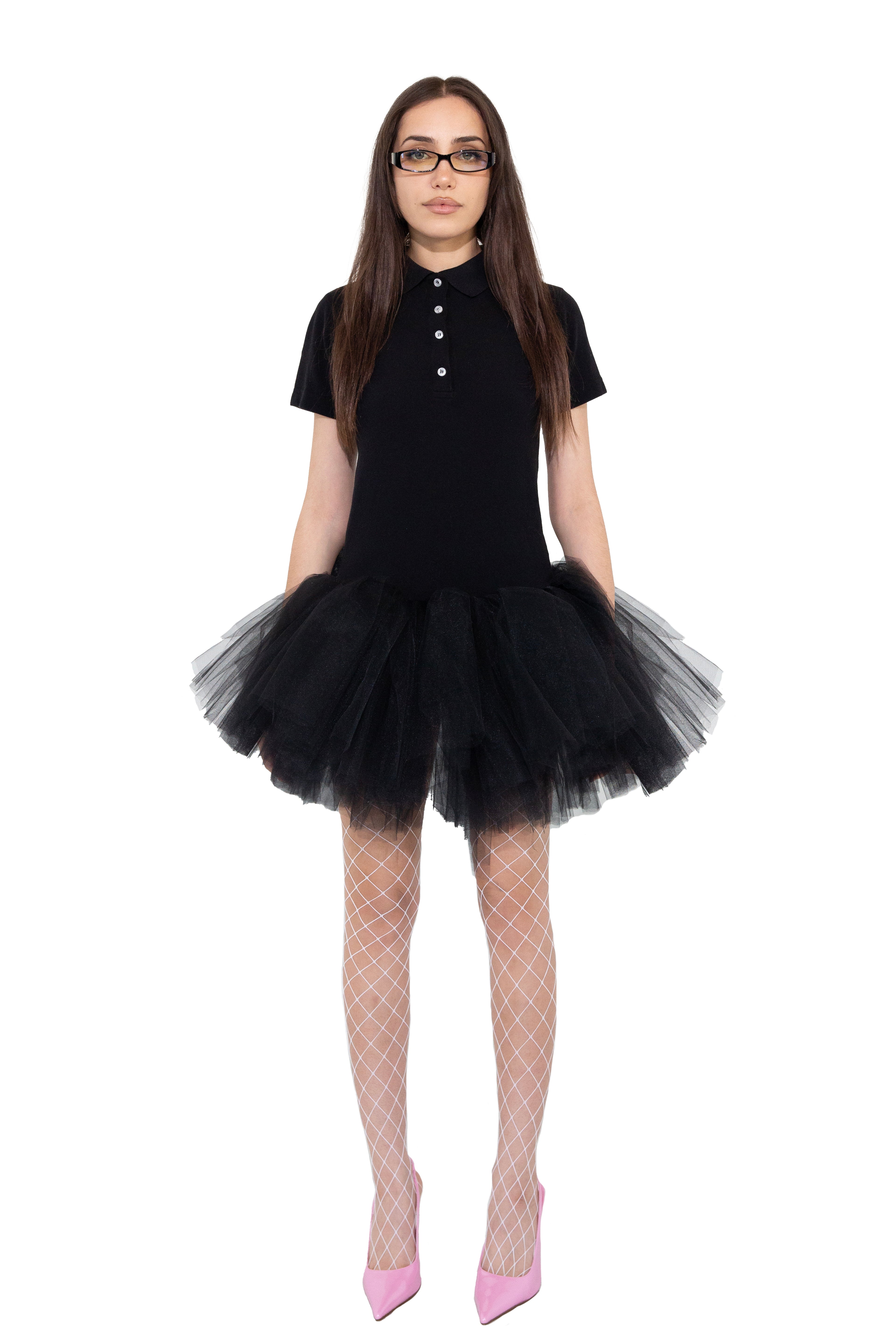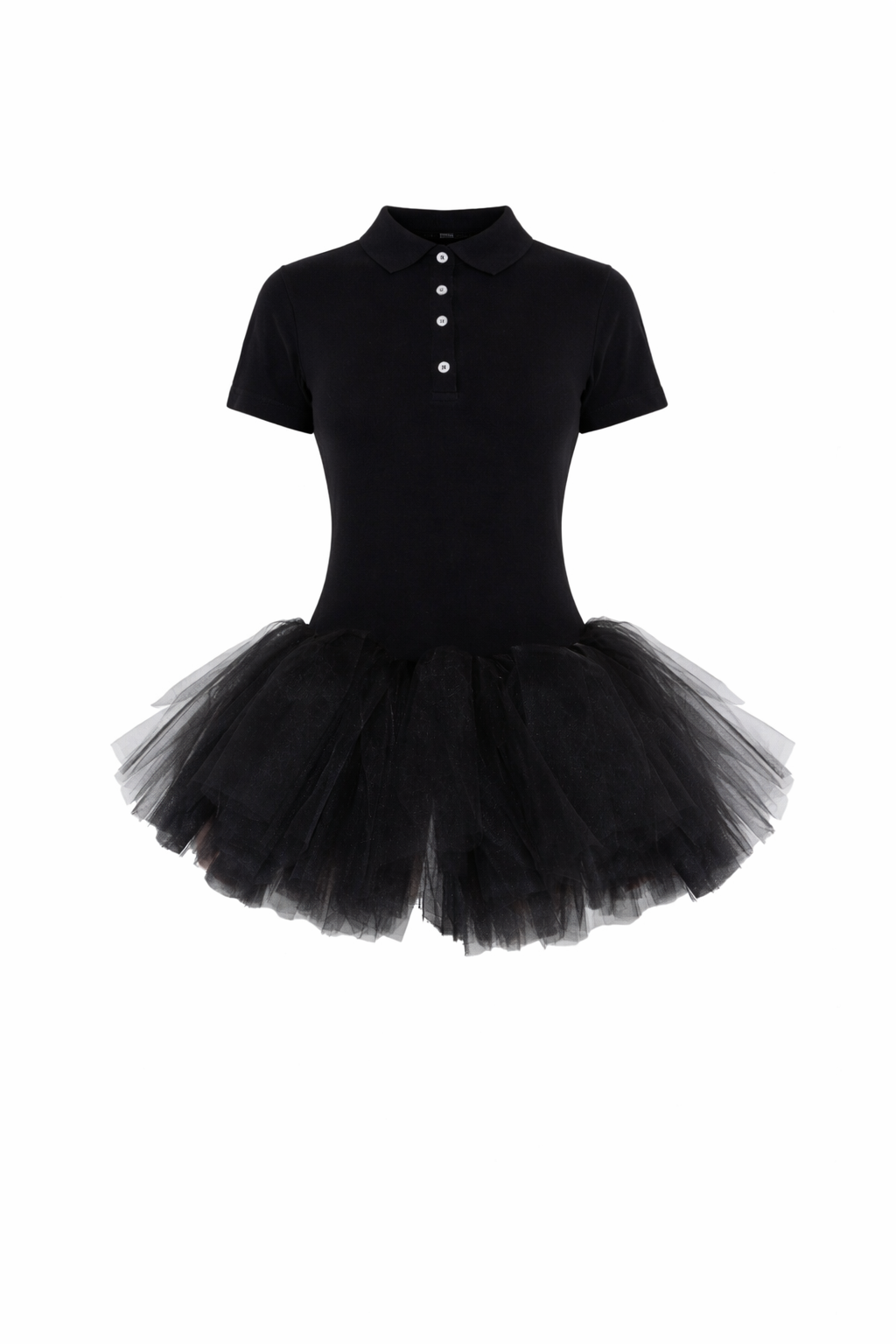 A fitted short sleeve dress in black featuring a clean, sculpted bodice and exaggerated swan like volume through the skirt. Designed as a pull over silhouette, the structured upper body contrasts with a fully layered tulle understructure that creates a dramatic, rounded shape. Minimal from the waist up, theatrical from the waist down. Made in Los Angeles.