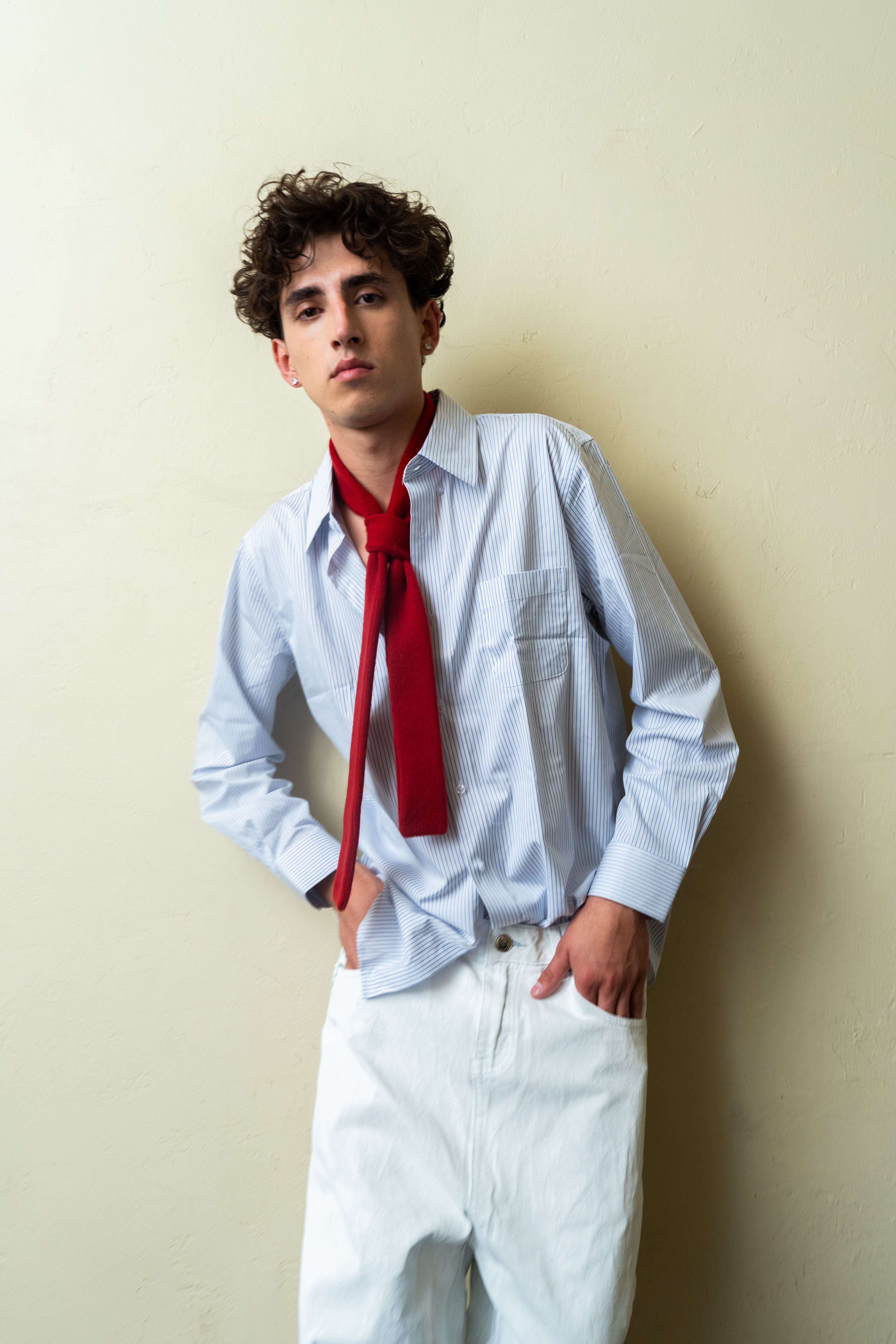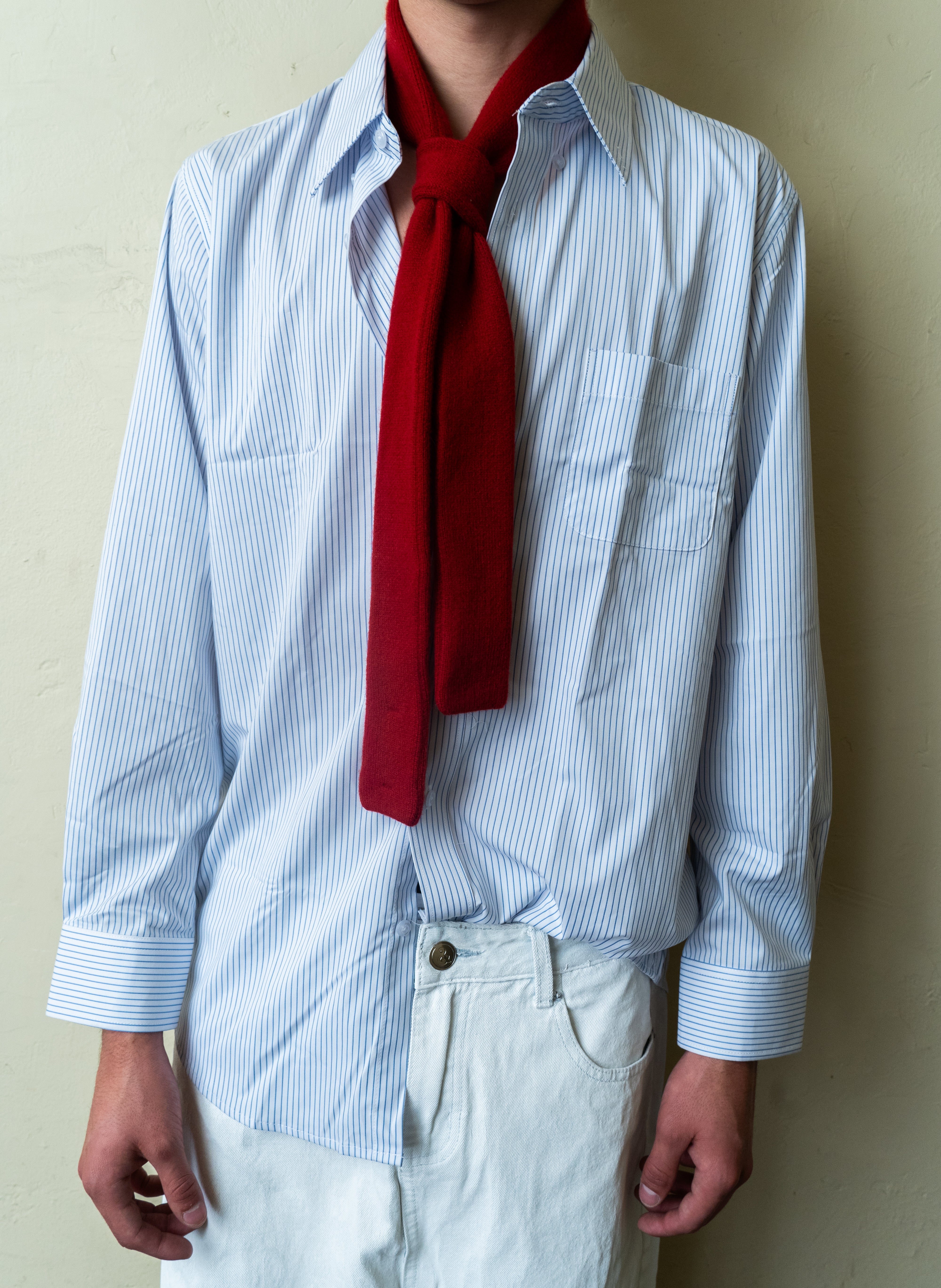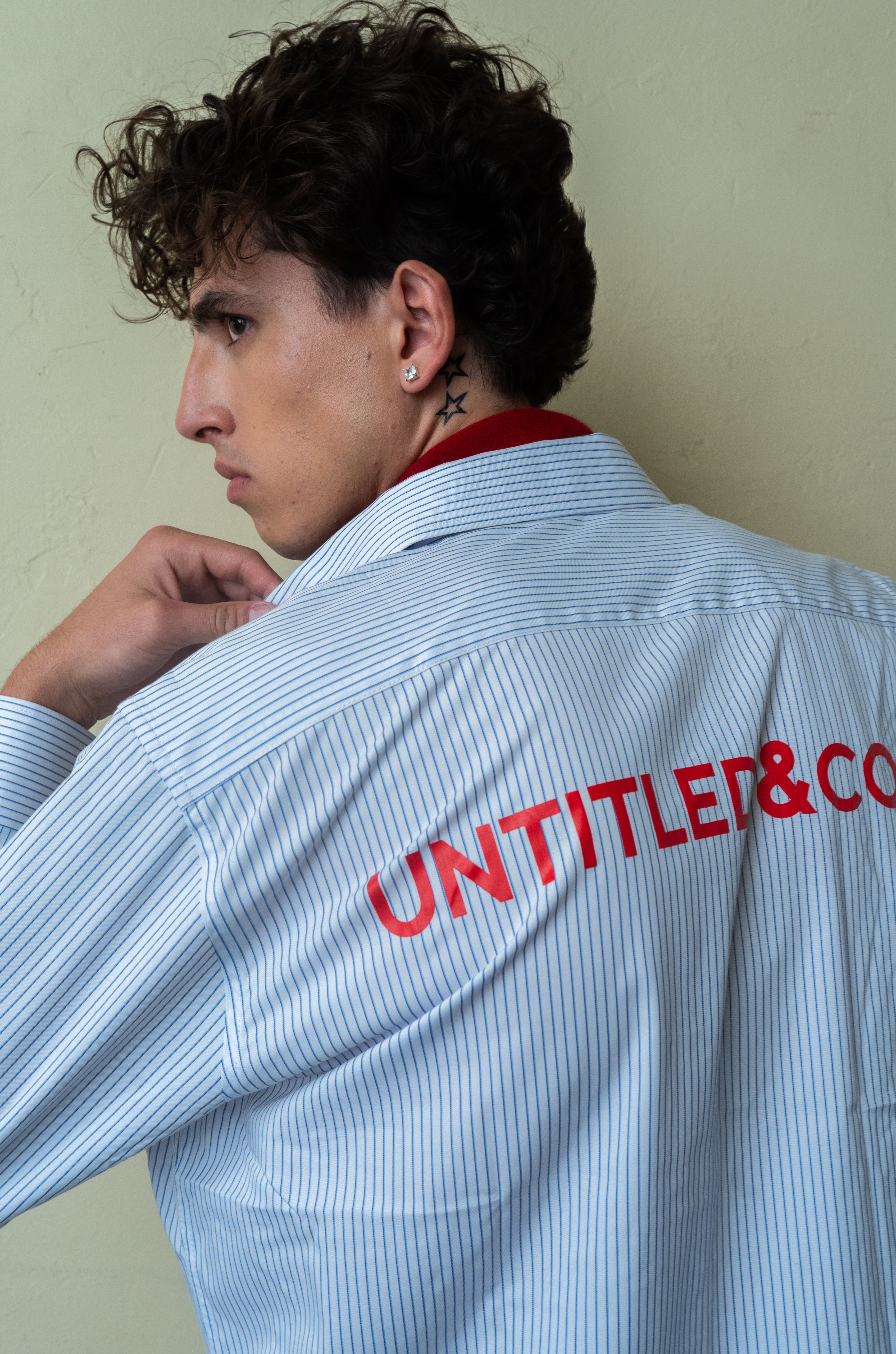 Striped cotton blend dress shirt with Red Script Logo printed vertically across the back.