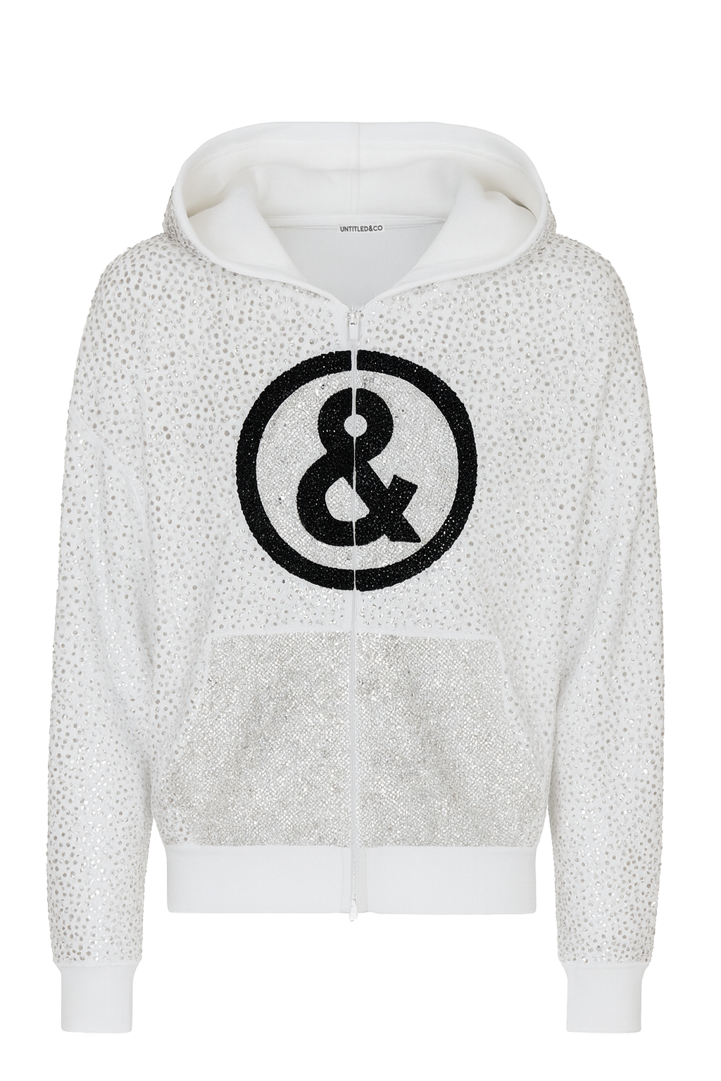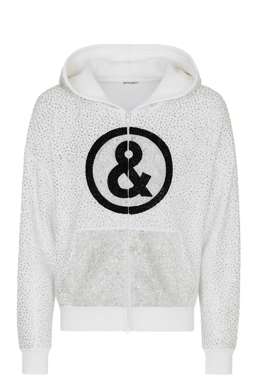 A fully crystal embellished cotton fleece hoodie featuring over 25,000 hand applied Preciosa crystals. Designed with an oversized silhouette and finished with the Untitled ampersand logo at the chest. Each piece is individually constructed and embellished in Los Angeles, making every hoodie a statement of labor and excess.